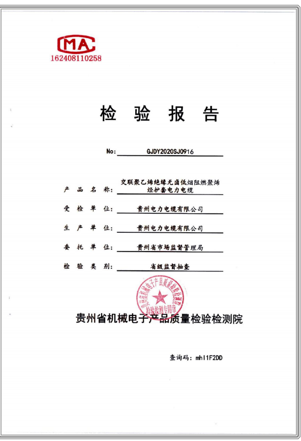 交聯(lián)聚乙烯絕緣無鹵低煙阻燃聚烯烴護(hù)套電纜 檢驗(yàn)報告